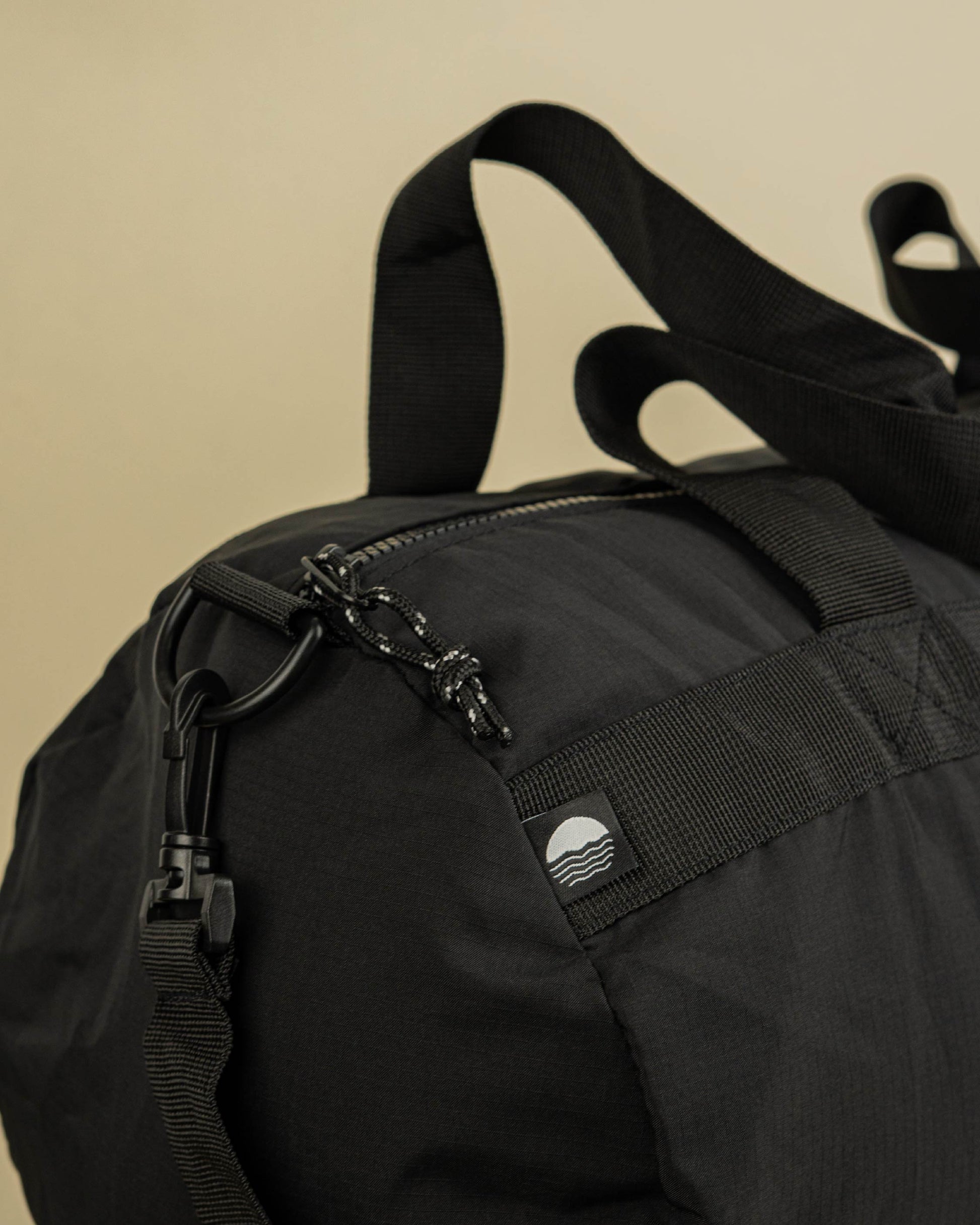 Foldable bag crafted with ripstop made from recycled plastic waste.