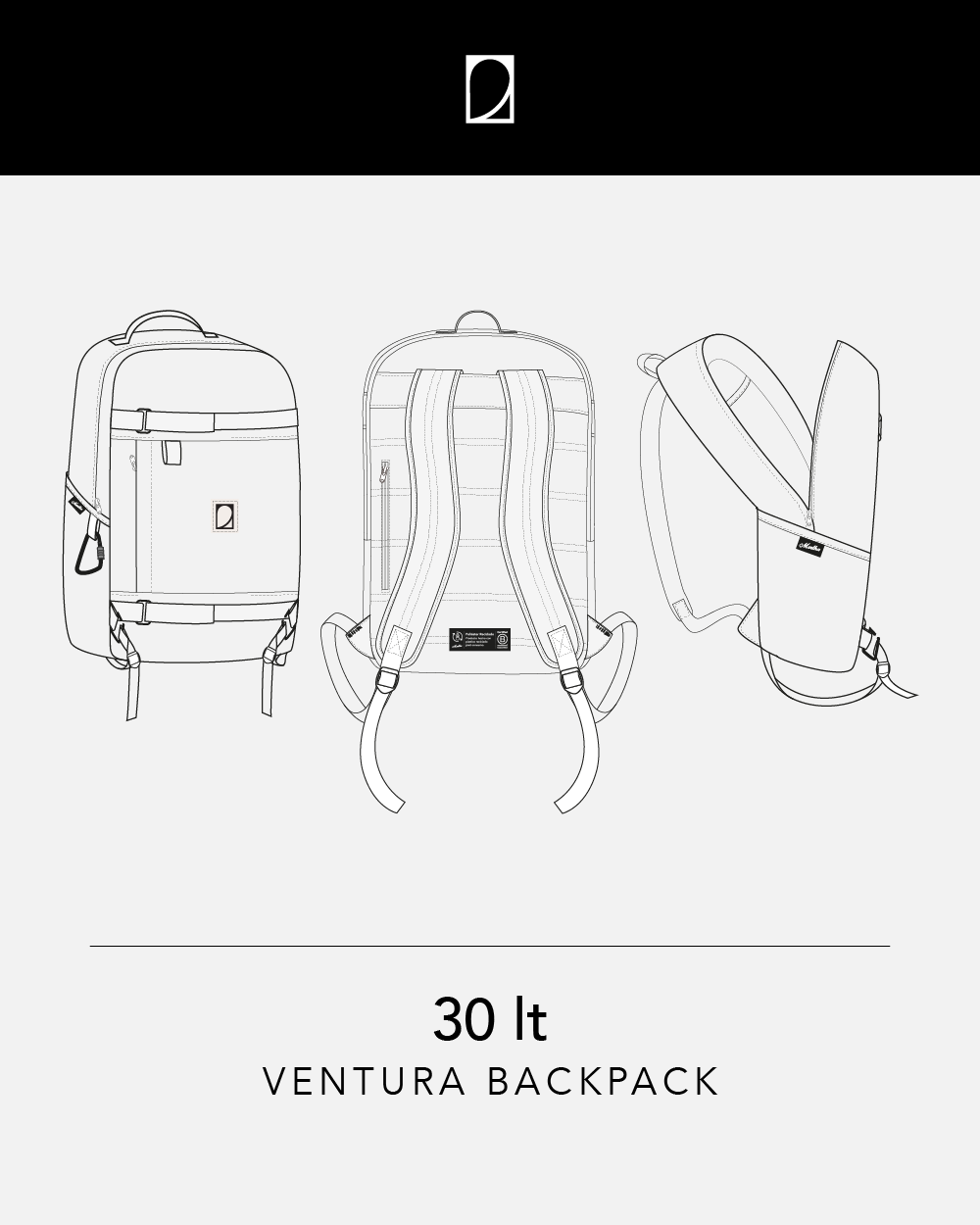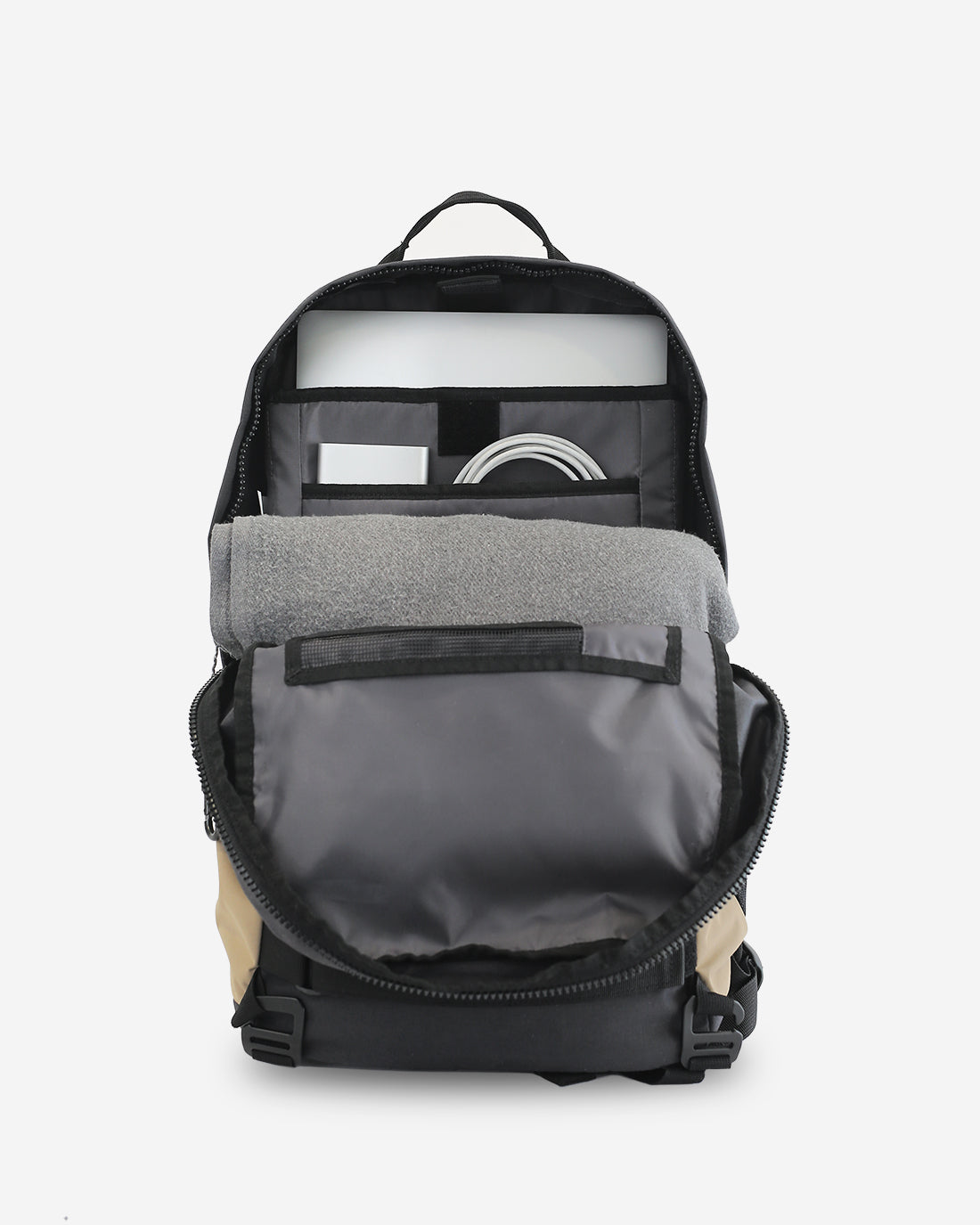 This 30-liter backpack features a large central pocket with a padded 15’’ laptop compartment, an internal divider, two side stretch pockets, a front secure-zip pocket, and a back zipper for easy access.