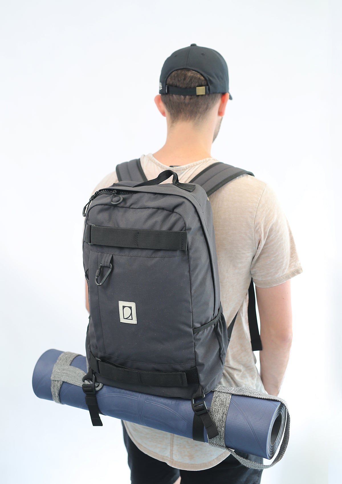 The front also features two adjustable straps, with additional removable bottom strap holders for larger items such as a yoga mat.